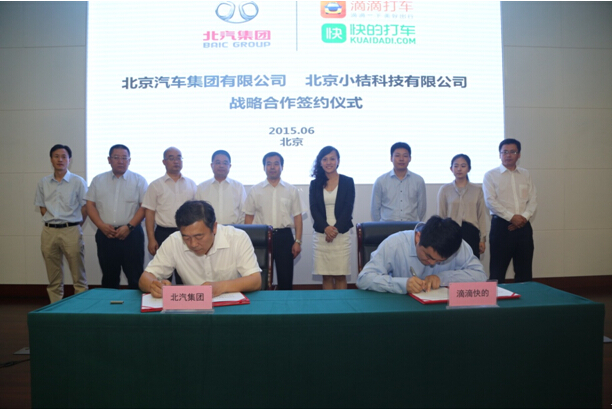 6月4日,北京汽車集團有限公司與北京小桔科技有限公司(滴滴快的)簽訂戰(zhàn)略合作協(xié)議。北汽集團攜手“互聯(lián)網(wǎng)+”又出新成果。