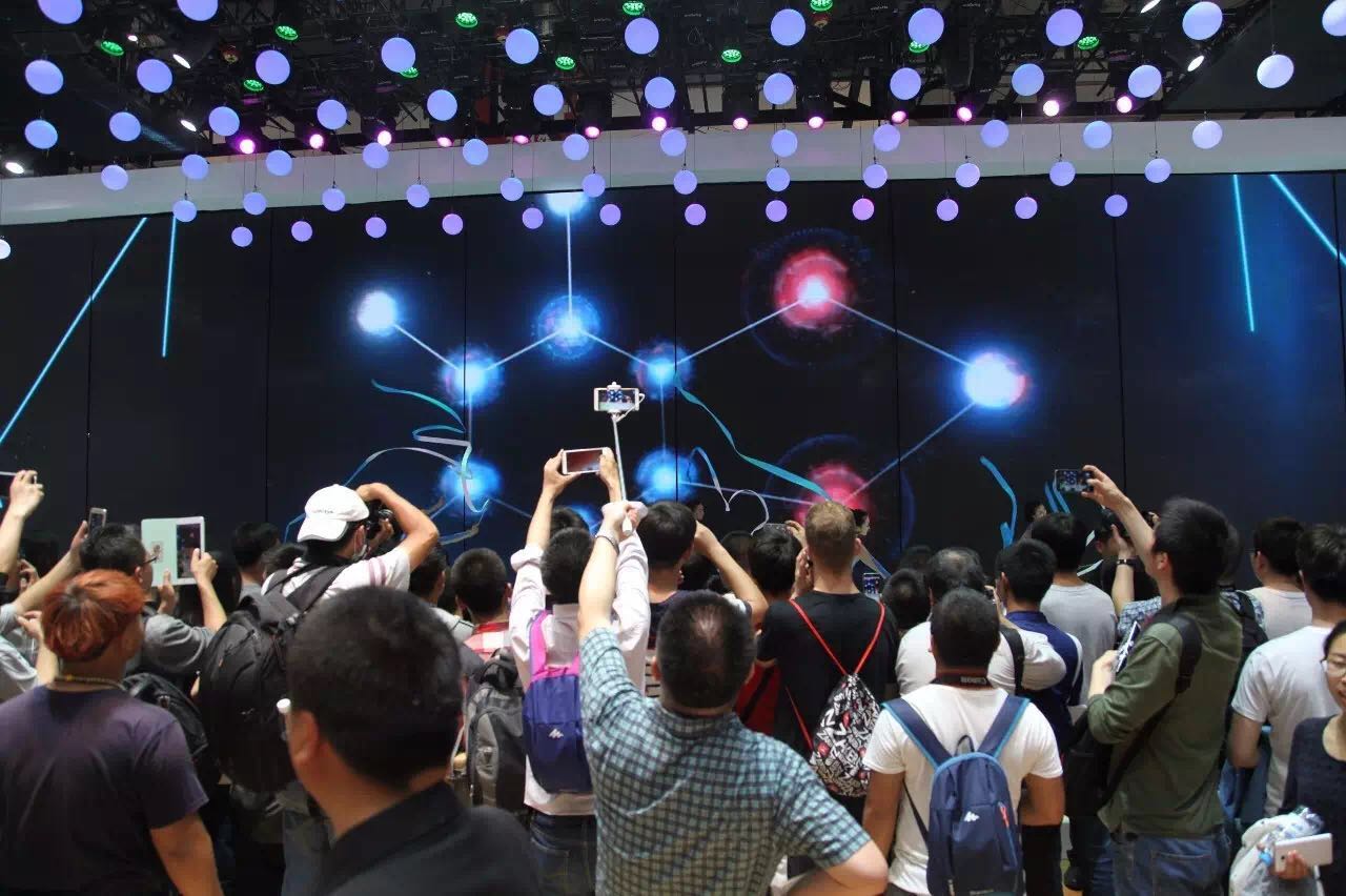奪人眼目的是,展廳上方浮動著的彩色氣球燈。這些數以百計的小燈以電腦編程控制上下浮動,可謂是波瀾壯闊。此外主展臺的大屏,旋轉開合、精彩迭出。如此大范圍的組合應用,在世界大型車展上并不多見。